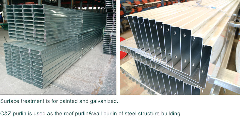 There are two types of purlin, C section and Z section. Surface treatment for C/Z purlin includes painted or galvanized. Usually C/Z purlin are used as the roof purlin and wall purlin for the steel structure building.