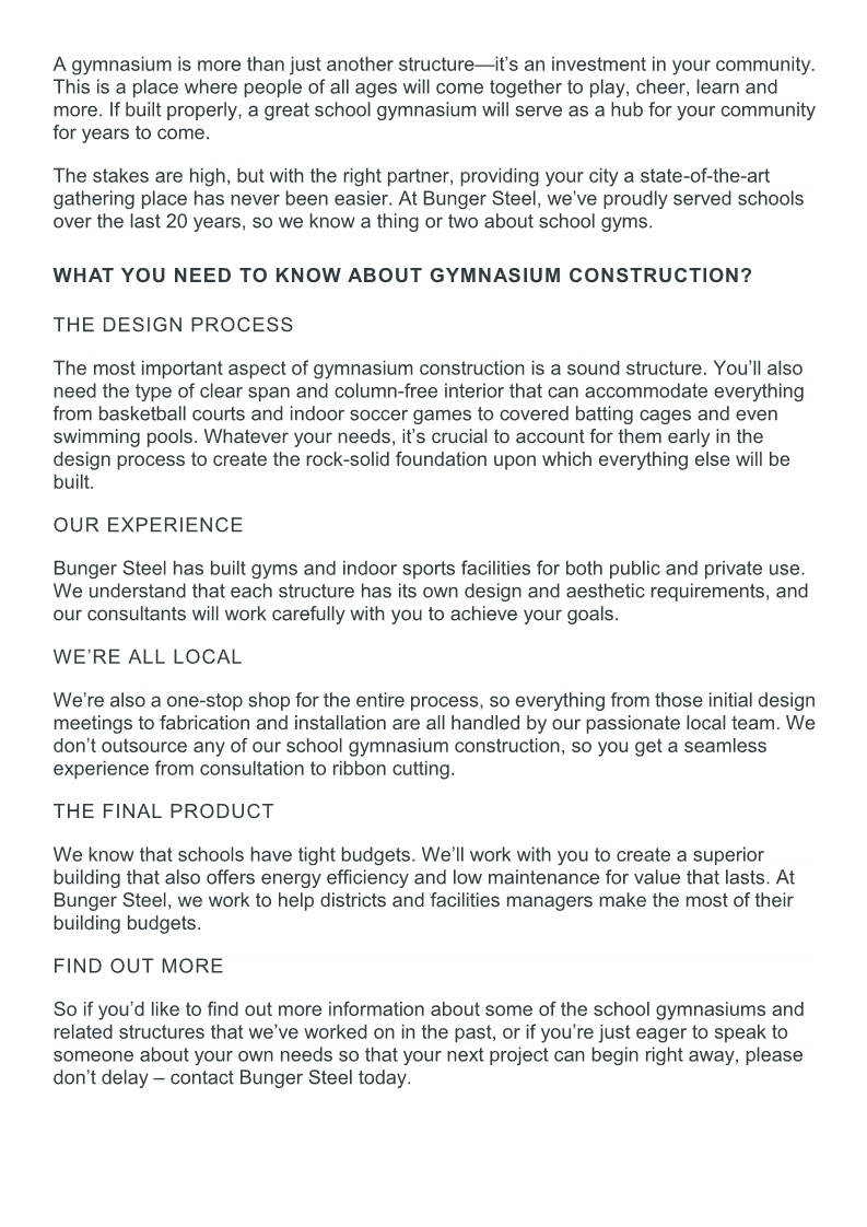 Steel building is a modern solution for gymnasiums. Steel structures feature clear span framing, allowing for the column-free interiors and high ceilings that metal gymnasiums require.