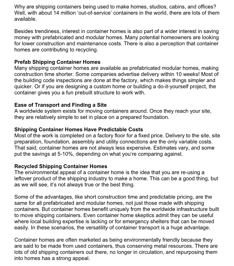 A shipping container home is a dwelling made from steel shipping containers—large reusable intermodal containers that transport goods. Shipping containers are available in two sizes: 20 feet by 8 feet or 40 feet x 8 feet