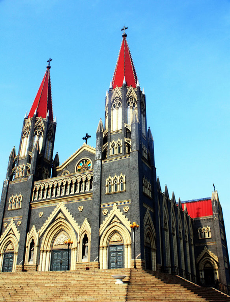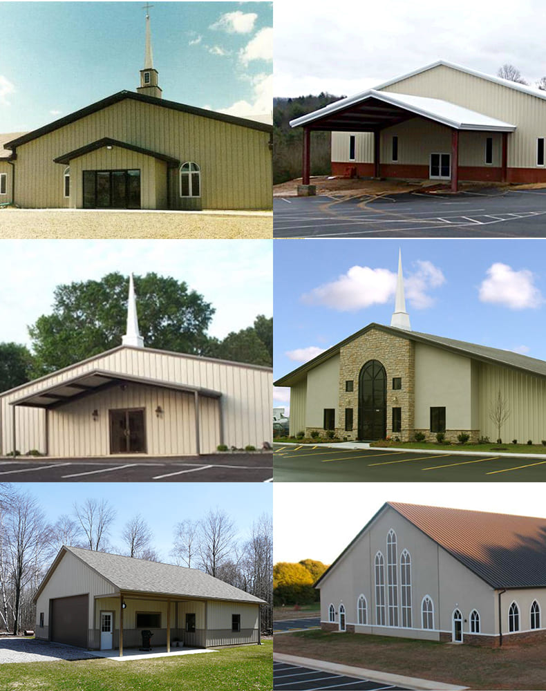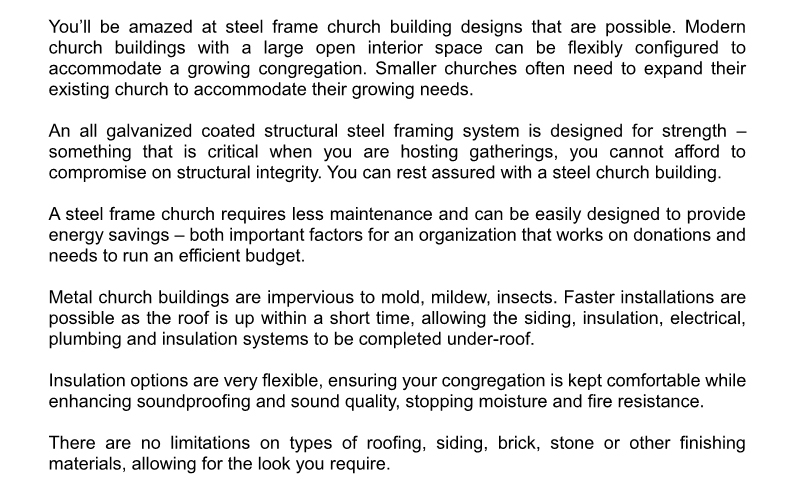 steel structure church building normally has a long span without middle columns. Another feature is the high pitched roof.
